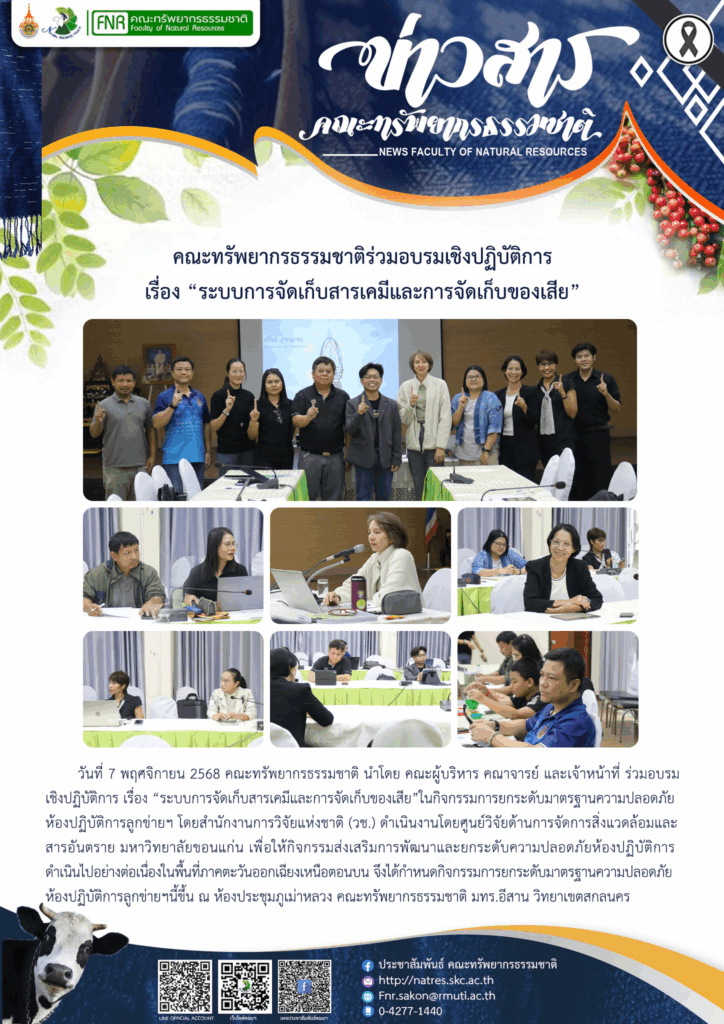 วันที่ 7 พฤศจิกายน 2568 คณะทรัพยากรธรรมชาติ นำโดย คณะผู้บริหาร คณาจารย์ และเจ้าหน้าที่ ร่วมอบรมเชิงปฏิบัติการ เรื่อง “ระบบการจัดเก็บสารเคมีและการจัดเก็บของเสีย”ในกิจกรรมการยกระดับมาตรฐานความปลอดภัยห้องปฏิบัติการลูกข่ายฯ โดยสำนักงานการวิจัยแห่งชาติ (วช.) ดำเนินงานโดยศูนย์วิจัยด้านการจัดการสิ่งแวดล้อมและสารอันตราย มหาวิทยาลัยขอนแก่น เพื่อให้กิจกรรมส่งเสริมการพัฒนาและยกระดับความปลอดภัยห้องปฏิบัติการดำเนินไปอย่างต่อเนื่องในพื้นที่ภาคตะวันออกเฉียงเหนือตอนบน จึงได้กำหนดกิจกรรมการยกระดับมาตรฐานความปลอดภัยห้องปฏิบัติการลูกข่ายฯนี้ขึ้น ณ ห้องประชุมภูเม่าหลวง คณะทรัพยากรธรรมชาติ มทร.อีสาน วิทยาเขตสกลนคร