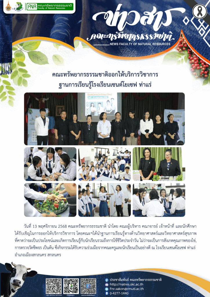วันที่ 13 พฤศจิกายน 2568 คณะทรัพยากรธรรมชาติ นำโดย คณะผู้บริหาร คณาจารย์ เจ้าหน้าที่ และนักศึกษา ได้รับเชิญในการออกให้บริการวิชาการ โดยคณะฯได้นำฐานการเรียนรู้ทางด้านวิทยาศาสตร์และวิทยาศาสตร์สุขภาพ ที่คาดว่าจะเป็นประโยชน์และเกิดการเรียนรู้กับนักเรียนรวมถึงการใช้ชีวิตประจำวัน ไม่ว่าจะเป็นการสังเกตคุณภาพของไข่, การตรวจวัดชีพจร เป็นต้น ซึ่งกิจกรรมได้รับความร่วมมือจากคณะครูและนักเรียนเป็นอย่างดี ณ โรงเรียนเซนต์โยเซฟ ท่าแร่ อำเภอเมืองสกลนคร สกลนคร