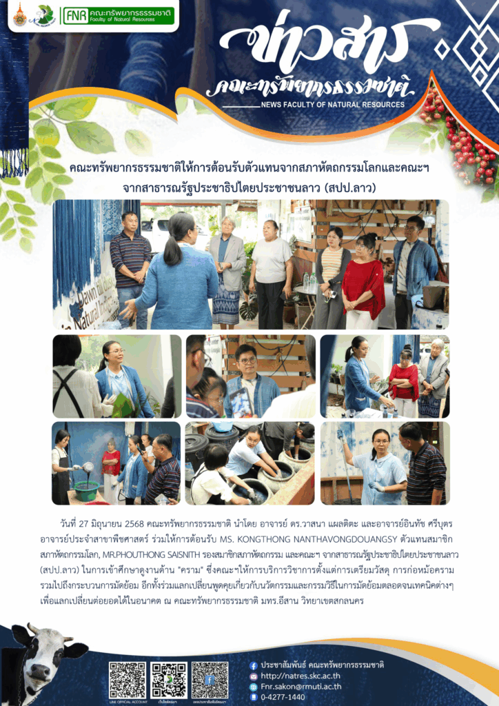 วันที่ 27 มิถุนายน 2568 คณะทรัพยากรธรรมชาติ นำโดย อาจารย์ ดร.วาสนา แผลติตะ และอาจารย์อินทัช ศรีบุตร อาจารย์ประจำสาขาพืชศาสตร์ ร่วมให้การต้อนรับ Ms. Kongthong Nanthavongdouangsy ตัวแทนสมาชิกสภาหัตถกรรมโลก, Mr.Phouthong Saisnith รองสมาชิกสภาหัตถกรรม และคณะฯ จากสาธารณรัฐประชาธิปไตยประชาชนลาว (สปป.ลาว) ในการเข้าศึกษาดูงานด้าน “คราม” ซึ่งคณะฯให้การบริการวิชาการตั้งแต่การเตรียมวัสดุ การก่อหม้อคราม รวมไปถึงกระบวนการมัดย้อม อีกทั้งร่วมแลกเปลี่ยนพูดคุยเกี่ยวกับนวัตกรรมและกรรมวิธีในการมัดย้อมตลอดจนเทคนิคต่างๆ เพื่อแลกเปลี่ยนต่อยอดได้ในอนาคต ณ คณะทรัพยากรธรรมชาติ มทร.อีสาน วิทยาเขตสกลนคร