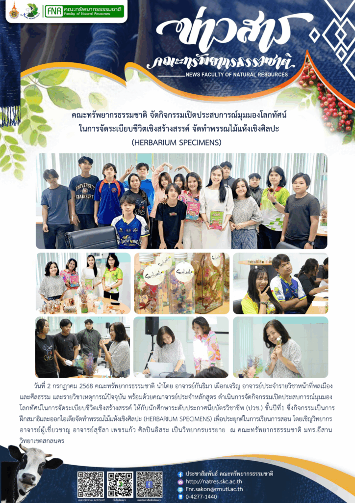 คณะทรัพยากรธรรมชาติ จัดกิจกรรมเปิดประสบการณ์มุมมองโลกทัศน์ในการจัดระเบียบชีวิตเชิงสร้างสรรค์ จัดทำพรรณไม้แห้งเชิงศิลปะ (Herbarium Specimens)