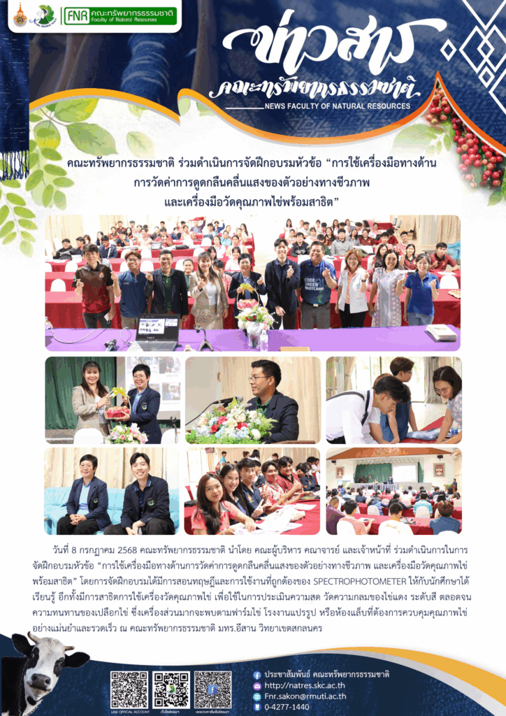 วันที่ 8 กรกฏาคม 2568 คณะทรัพยากรธรรมชาติ นำโดย คณะผู้บริหาร คณาจารย์ และเจ้าหน้าที่ ร่วมดำเนินการในการจัดฝึกอบรมหัวข้อ “การใช้เครื่องมือทางด้านการวัดค่าการดูดกลืนคลื่นแสงของตัวอย่างทางชีวภาพ และเครื่องมือวัดคุณภาพไข่พร้อมสาธิต” โดยการจัดฝึกอบรมได้มีการสอนทฤษฎีและการใช้งานที่ถูกต้องของ Spectrophotometer ให้กับนักศึกษาได้เรียนรู้ อีกทั้งมีการสาธิตการใช้เครื่องวัดคุณภาพไข่ เพื่อใช้ในการประเมินความสด วัดความกลมของไข่แดง ระดับสี ตลอดจนความทนทานของเปลือกไข่ ซึ่งเครื่องส่วนมากจะพบตามฟาร์มไข่ โรงงานแปรรูป หรือห้องแล็บที่ต้องการควบคุมคุณภาพไข่อย่างแม่นยำและรวดเร็ว ณ คณะทรัพยากรธรรมชาติ มทร.อีสาน วิทยาเขตสกลนคร