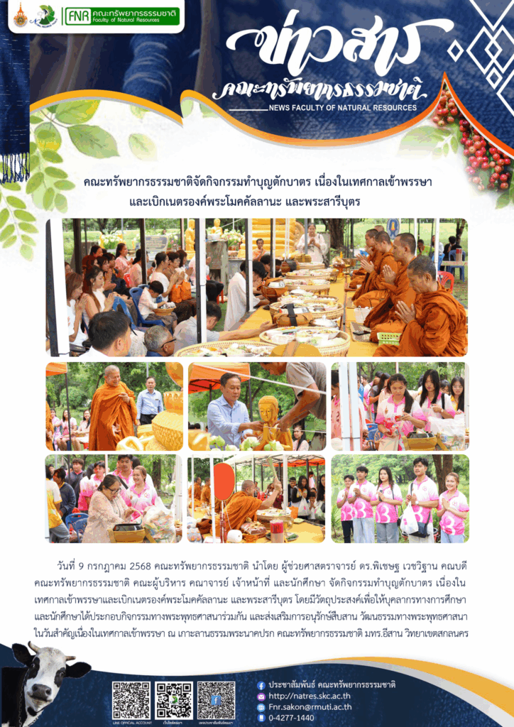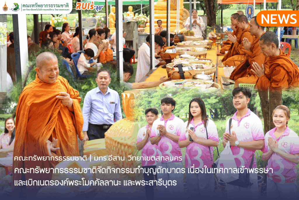 วันที่ 9 กรกฎาคม 2568 คณะทรัพยากรธรรมชาติ นำโดย ผู้ช่วยศาสตราจารย์ ดร.พิเชษฐ เวชวิฐาน คณบดีคณะทรัพยากรธรรมชาติ คณะผู้บริหาร คณาจารย์ เจ้าหน้าที่ และนักศึกษา จัดกิจกรรมทำบุญตักบาตร เนื่องในเทศกาลเข้าพรรษาและเบิกเนตรองค์พระโมคคัลลานะ และพระสารีบุตร โดยมีวัตถุประสงค์เพื่อให้บุคลากรทางการศึกษา และนักศึกษาได้ประกอบกิจกรรมทางพระพุทธศาสนาร่วมกัน และส่งเสริมการอนุรักษ์สืบสาน วัฒนธรรมทางพระพุทธศาสนา ในวันสำคัญเนื่องในเทศกาลเข้าพรรษา ณ เกาะลานธรรมพระนาคปรก คณะทรัพยากรธรรมชาติ มทร.อีสาน วิทยาเขตสกลนคร