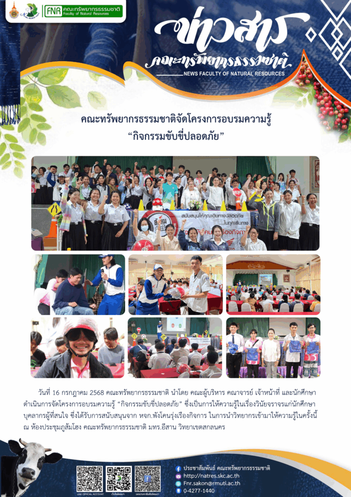 วันที่ 16 กรกฎาคม 2568 คณะทรัพยากรธรรมชาติ นำโดย คณะผู้บริหาร คณาจารย์ เจ้าหน้าที่ และนักศึกษา ดำเนินการจัดโครงการอบรมความรู้ “กิจกรรมขับขี่ปลอดภัย” ซึ่งเป็นการให้ความรู้ในเรื่องวินัยจราจรแก่นักศึกษา บุคลากรผู้ที่สนใจ ซึ่งได้รับการสนับสนุนจาก หจก.พังโคนรุ่งเรืองกิจการ ในการนำวิทยากรเข้ามาให้ความรู้ในครั้งนี้ ณ ห้องประชุมภูส้มโฮง คณะทรัพยากรธรรมชาติ มทร.อีสาน วิทยาเขตสกลนคร