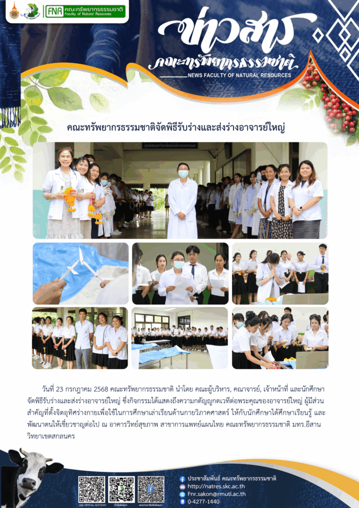 วันที่ 23 กรกฎาคม 2568 คณะทรัพยากรธรรมชาติ นำโดย คณะผู้บริหาร, คณาจารย์, เจ้าหน้าที่ และนักศึกษา จัดพิธีรับร่างและส่งร่างอาจารย์ใหญ่ ซึ่งกิจกรรมได้แสดงถึงความกตัญญูกตเวทีต่อพระคุณของอาจารย์ใหญ่ ผู้มีส่วนสำคัญที่ตั้งจิตอุทิศร่างกายเพื่อใช้ในการศึกษาเล่าเรียนด้านกายวิภาคศาสตร์ ให้กับนักศึกษาได้ศึกษาเรียนรู้ และพัฒนาตนให้เชี่ยวชาญต่อไป ณ อาคารวิทย์สุขภาพ สาขาการแพทย์แผนไทย คณะทรัพยากรธรรมชาติ มทร.อีสาน วิทยาเขตสกลนคร