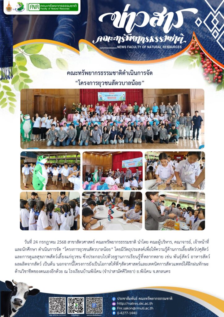 วันที่ 24 กรกฎาคม 2568 สาขาสัตวศาสตร์ คณะทรัพยากรธรรมชาติ นำโดย คณะผู้บริหาร, คณาจารย์, เจ้าหน้าที่ และนักศึกษา ดำเนินการจัด “โครงการยุวชนสัตวบาลน้อย” โดยมีวัตถุประสงค์เพื่อให้ความรู้ด้านการเลี้ยงสัตว์ปศุสัตว์และการดูแลสุขภาพสัตว์เลี้ยงแก่ยุวชน ซึ่งประกอบไปด้วยฐานการเรียนรู้ที่หลากหลาย เช่น พันธุ์สัตว์ อาหารสัตว์ ผลผลิตจากสัตว์ เป็นต้น นอกจากนี้โครงการยังเป็นโอกาสให้พี่ๆสัตวศาสตร์และเทคนิคการสัตวแพทย์ได้ฝึกฝนทักษะด้านวิชาชีพของตนเองอีกด้วย ณ โรงเรียนบ้านพังโคน (จำปาสามัคคีวิทยา) อ.พังโคน จ.สกลนคร