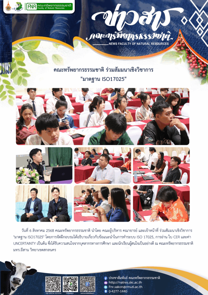 วันที่ 6 สิงหาคม 2568 คณะทรัพยากรธรรมชาติ นำโดย คณะผู้บริหาร คณาจารย์ และเจ้าหน้าที่ ร่วมสัมมนาเชิงวิชาการ “มาตฐาน ISO17025” โดยการจัดฝึกอบรมได้อธิบายเกี่ยวกับข้อแนะนำในการทำระบบ ISO 17025, การอ่าน ใบ Cer และค่า Uncertainty เป็นต้น ซึ่งได้รับความสนใจจากบุคลากรทางการศึกษา และนักเรียนผู้สนใจเป็นอย่างดี ณ คณะทรัพยากรธรรมชาติ มทร.อีสาน วิทยาเขตสกลนคร