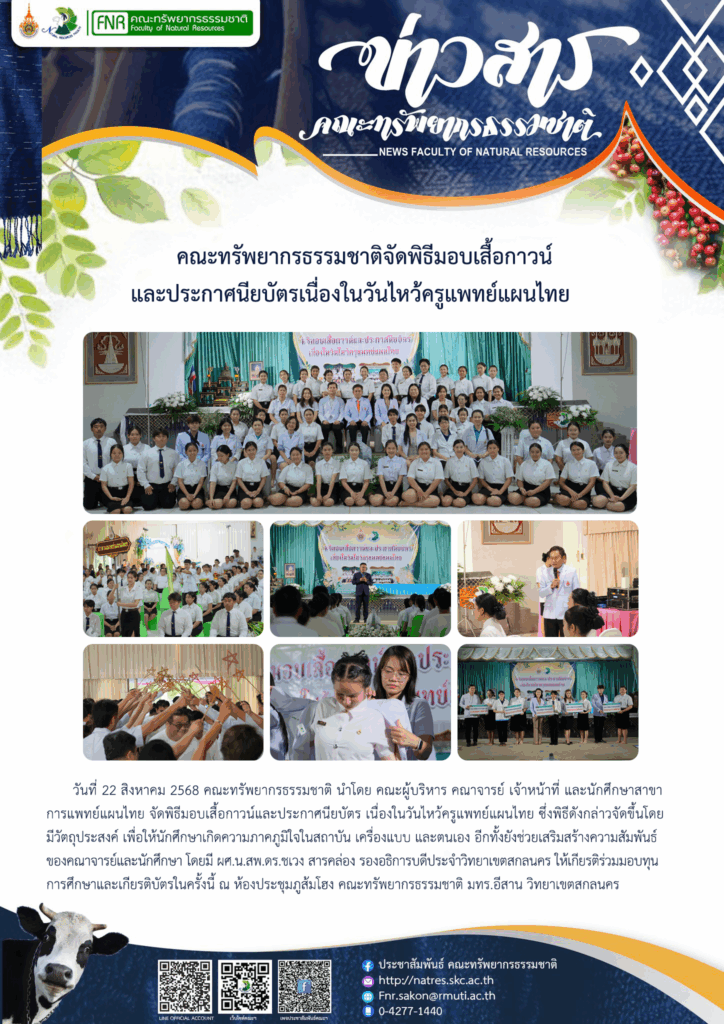 วันที่ 22 สิงหาคม 2568 คณะทรัพยากรธรรมชาติ นำโดย คณะผู้บริหาร คณาจารย์ เจ้าหน้าที่ และนักศึกษาสาขาการแพทย์แผนไทย จัดพิธีมอบเสื้อกาวน์และประกาศนียบัตร เนื่องในวันไหว้ครูแพทย์แผนไทย ซึ่งพิธีดังกล่าวจัดขึ้นโดยมีวัตถุประสงค์ เพื่อให้นักศึกษาเกิดความภาคภูมิใจในสถาบัน เครื่องแบบ และตนเอง อีกทั้งยังช่วยเสริมสร้างความสัมพันธ์ของคณาจารย์และนักศึกษา โดยมี ผศ.น.สพ.ดร.ชเวง สารคล่อง รองอธิการบดีประจำวิทยาเขตสกลนคร ให้เกียรติร่วมมอบทุนการศึกษาและเกียรติบัตรในครั้งนี้ ณ ห้องประชุมภูส้มโฮง คณะทรัพยากรธรรมชาติ มทร.อีสาน วิทยาเขตสกลนคร