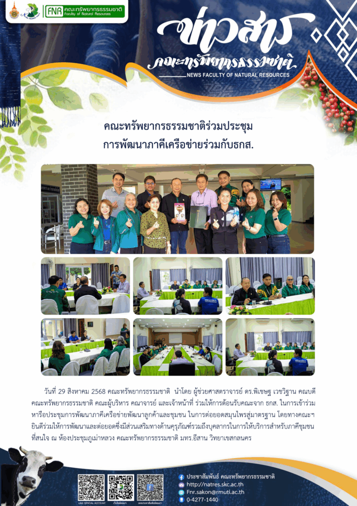 วันที่ 29 สิงหาคม 2568 คณะทรัพยากรธรรมชาติ นำโดย ผู้ช่วยศาสตราจารย์ ดร.พิเชษฐ เวชวิฐาน คณบดีคณะทรัพยากรธรรมชาติ คณะผู้บริหาร คณาจารย์ และเจ้าหน้าที่ ร่วมให้การต้อนรับคณะจาก ธกส. ในการเข้าร่วมหารือประชุมการพัฒนาภาคีเครือข่ายพัฒนาลูกค้าและชุมชน ในการต่อยอดสมุนไพรสู่มาตรฐาน โดยทางคณะฯ ยินดีร่วมให้การพัฒนาและต่อยอดซึ่งมีส่วนเสริมทางด้านคุรุภัณฑ์รวมถึงบุคลากรในการให้บริการสำหรับภาคีชุมชนที่สนใจ ณ ห้องประชุมภูเม่าหลวง คณะทรัพยากรธรรมชาติ มทร.อีสาน วิทยาเขสกลนคร
