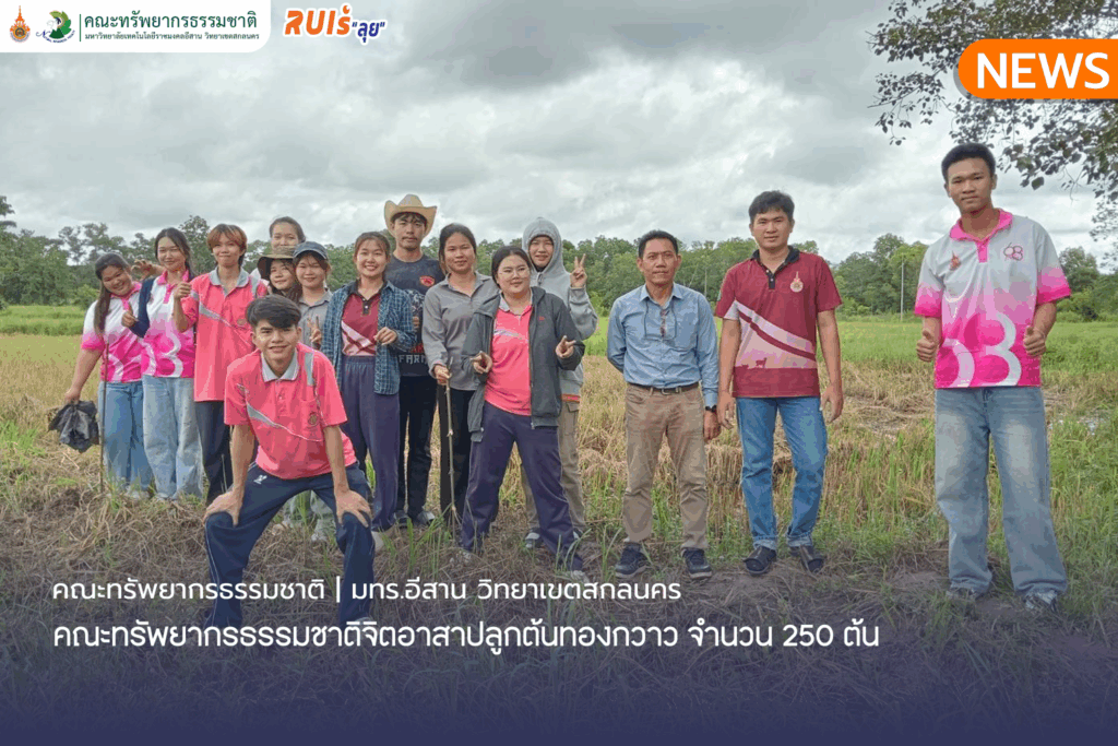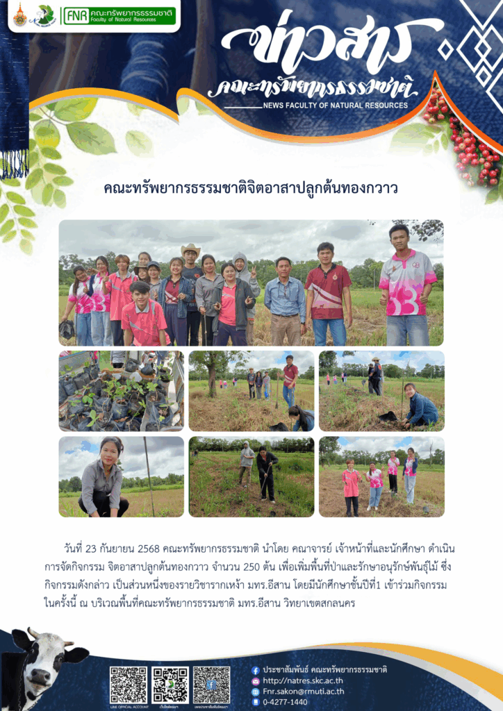 วันที่ 23 กันยายน 2568 คณะทรัพยากรธรรมชาติ นำโดย คณาจารย์ เจ้าหน้าที่และนักศึกษา ดำเนินการจัดกิจกรรม จิตอาสาปลูกต้นทองกวาว จำนวน 250 ต้น เพื่อเพิ่มพื้นที่ป่าและรักษาอนุรักษ์พันธุ์ไม้ ซึ่งกิจกรรมดังกล่าว เป็นส่วนหนึ่งของรายวิชารากเหง้า มทร.อีสาน โดยมีนักศึกษาชั้นปีที่1 เข้าร่วมกิจกรรมในครั้งนี้ ณ บริเวณพื้นที่คณะทรัพยากรธรรมชาติ มทร.อีสาน วิทยาเขตสกลนคร