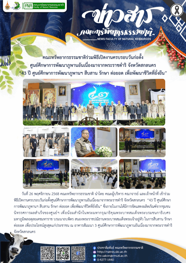 วันที่ 26 พฤศจิกายน 2568 คณะทรัพยากรธรรมชาติ นำโดย คณะผู้บริหาร คณาจารย์ และเจ้าหน้าที่ เข้าร่วมพิธีเปิดงานครบรอบวันก่อตั้งศูนย์ศึกษาการพัฒนาภูพานอันเนื่องมาจากพระราชดำริ จังหวัดสกลนคร “43 ปี ศูนย์ศึกษาการพัฒนาภูพานฯ สืบสาน รักษา ต่อยอด เพื่อพัฒนาชีวิตที่ยั่งยืน” ซึ่งภายในงานได้มีการจัดแสดงผลิตภัณฑ์จากชุมชน นิทรรศการผลสำเร็จของศูนย์ฯ เพื่อน้อมสำนึกในพระมหากรุณาธิคุณพระบาทสมเด็จพระบรมชนกาธิเบศร มหาภูมิพลอดุลยเดชมหาราช บรมนาถบพิตร สนองพระราชปณิธานพระบาทสมเด็จพระเจ้าอยู่หัว ในการสืบสาน รักษา ต่อยอด เพื่อประโยชน์สูงสุดแก่ประชาชน ณ อาคารสัมมนา 3 ศูนย์ศึกษาการพัฒนาภูพานอันเนื่องมาจากพระราชดำริ จังหวัดสกลนคร
