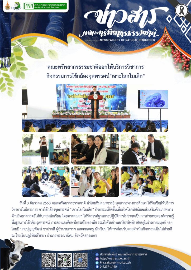 วันที่ 3 ธันวาคม 2568 คณะทรัพยากรธรรมชาติ นำโดยทีมคณาจารย์ บุคลากรทางการศึกษา ได้รับเชิญให้บริการวิชาการในโครงการ การใช้กล้องจุลทรรศน์ “เจาะโลกใบเล็ก” กิจกรรมนี้จัดขึ้นเพื่อเปิดโลกทัศน์และส่งเสริมศักยภาพทางด้านวิทยาศาสตร์ให้กับกลุ่มนักเรียน โดยทางคณะฯ ได้รังสรรค์ฐานการปฏิบัติการไม่ว่าจะเป็นการถ่ายทอดองค์ความรู้พื้นฐานการใช้กล้องจุลทรรศน์, การส่องและศึกษาโครงสร้างของพืช รวมถึงตัวอย่างพยาธิปรสิตที่อาศัยอยู่ในร่างกายมนุษย์ ฯลฯ โดยมี นายปุญญพัฒน์ ชาปากดี ผู้อำนวยการฯ และคณะครู นักเรียน ให้การต้อนรับและดำเนินกิจกรรมเป็นไปด้วยดี ณ โรงเรียนภูริทัตต์วิทยา อำเภอพรรณานิคม จังหวัดสกลนคร
