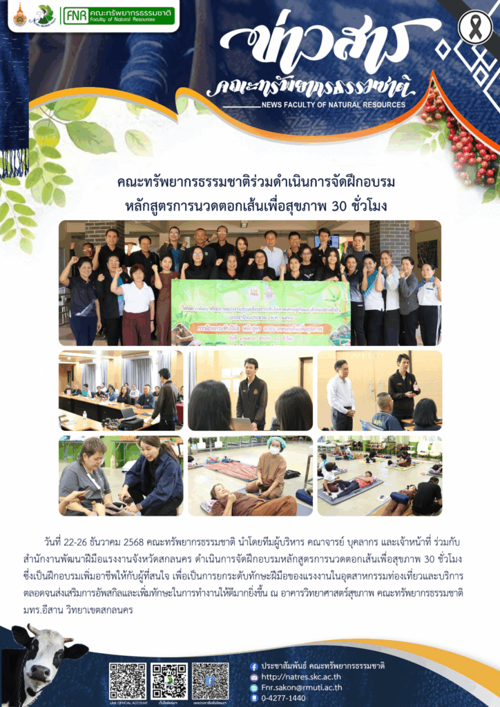 วันที่ 22-26 ธันวาคม 2568 คณะทรัพยากรธรรมชาติ นำโดยทีมผู้บริหาร คณาจารย์ บุคลากร และเจ้าหน้าที่ ร่วมกับสำนักงานพัฒนาฝีมือแรงงานจังหวัดสกลนคร ดำเนินการจัดฝึกอบรมหลักสูตรการนวดตอกเส้นเพื่อสุขภาพ 30 ชั่วโมง ซึ่งเป็นฝึกอบรมเพิ่มอาชีพให้กับผู้ที่สนใจ เพื่อเป็นการยกระดับทักษะฝีมือของแรงงานในอุตสาหกรรมท่องเที่ยวและบริการ ตลอดจนส่งเสริมการอัพสกิลและเพิ่มทักษะในการทำงานให้ดีมากยิ่งขึ้น ณ อาคารวิทยาศาสตร์สุขภาพ คณะทรัพยากรธรรมชาติ มทร.อีสาน วิทยาเขตสกลนคร