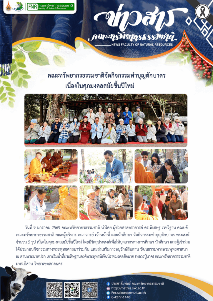 วันที่ 9 มกราคม 2569 คณะทรัพยากรธรรมชาติ นำโดย ผู้ช่วยศาสตราจารย์ ดร.พิเชษฐ เวชวิฐาน คณบดีคณะทรัพยากรธรรมชาติ คณะผู้บริหาร คณาจารย์ เจ้าหน้าที่ และนักศึกษา จัดกิจกรรมทำบุญตักบาตร พระสงฆ์ จำนวน 5 รูป เนื่องในศุภมงคลสมัยขึ้นปีใหม่ โดยมีวัตถุประสงค์เพื่อให้บุคลากรทางการศึกษา นักศึกษา และผู้เข้าร่วม ได้ประกอบกิจกรรมทางพระพุทธศาสนาร่วมกัน และส่งเสริมการอนุรักษ์สืบสาน วัฒนธรรมทางพระพุทธศาสนา ณ ลานพระนาคปรก เกาะริมน้ำที่ประดิษฐานองค์พระพุทธพิพัฒน์ราชมงคลสัตนาค (หลวงปู่นาค) คณะทรัพยากรธรรมชาติ มทร.อีสาน วิทยาเขตสกลนคร